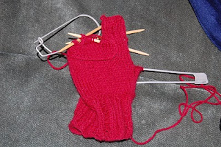 Boy, talk about a learning curve. The first part went fine. Then I got to the fingers. I don't think the thumb is going to be so bad, but the fingers, ye gods! First, I couldn't figure out the whole gusset thing. It took me about three froggings to get that sorted, including one down to the thumb and back up again. Then, I couldn't figure out what to do once I'd finished the first finger. Did I dare cut the yarn, and where did I get more to start the next bit? I figured that out at about 2 am last night, in one of my insomniac moments. I needed to cast on three stitches for another gusset anyway, between the next two fingers, so I might as well just take the yarn from that and use it to continue. All in all, it's been more an exercise in how to take things off needles and put them on again. In essence, I'm having trouble with putting it together, and not trouble with putting stitches aside, picking them up again, and the multi-needle techniques that go with it. One of the downsides of being unable to picture things and put them together.